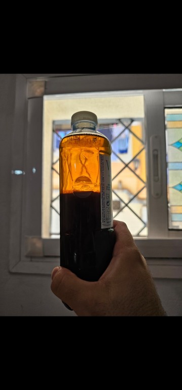 Por cierto ayer tuve un rato libre y decidí cambiar el aceite de la transmisión, se supone que hay que cambiarlo cada 30.000kms. Mi moto tiene unos 8500kms y 3 años. Lleva 325ml de aceite SAE 80W-90; API GL-4. Me pille 1L por 12€ de liquimoly El procedimiento es sencillo, vaya lo típico, quitar el tornillo de llenado, el de vaciado, dejar escurrir e inclinar la moto para vaciar completamente, yo lo hice en una garrafa abierta y solo vi 4 microscópicas motas de metal que solo se notaban al reaccionar a un imán, si no ni te enteras. Después de eso le eche 150ml más para limpiar mientras moví la rueda trasera varias veces. Después solo hay que rellenar hasta que el nivel se quede en el borde del tornillo de llenado. Os comparto foto de cómo estaba el aceite viejo, y encima del viejo el que usé para limpiar. Estaba en un estado discutible... ni la luz lo atraviesa!